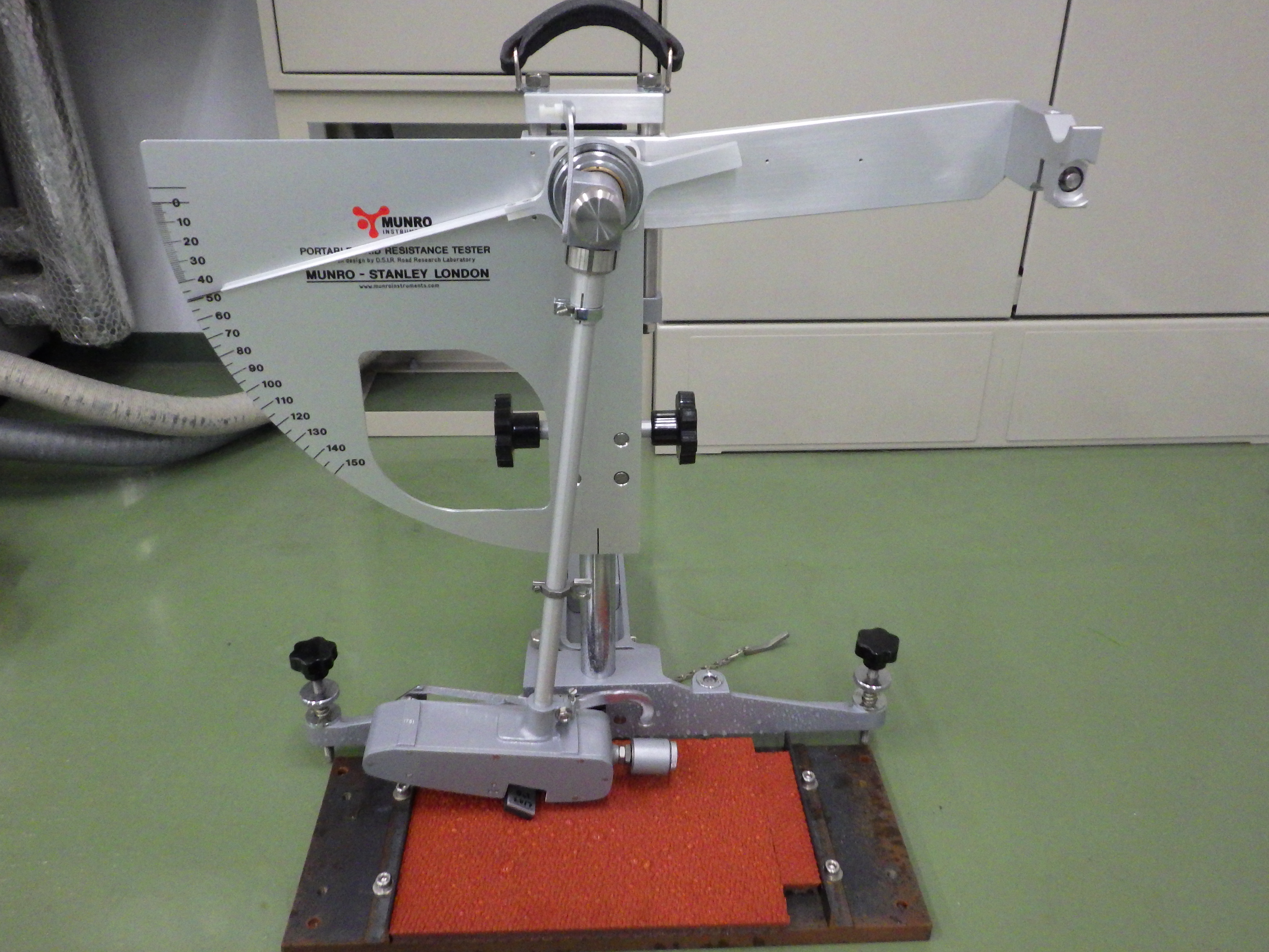 ペンジュラムアーム(振子アーム)の端に取付けたゴム製スライダーによって測定面をこすり、こすった時に生ずるエネルギーの損失を測定する装置です。